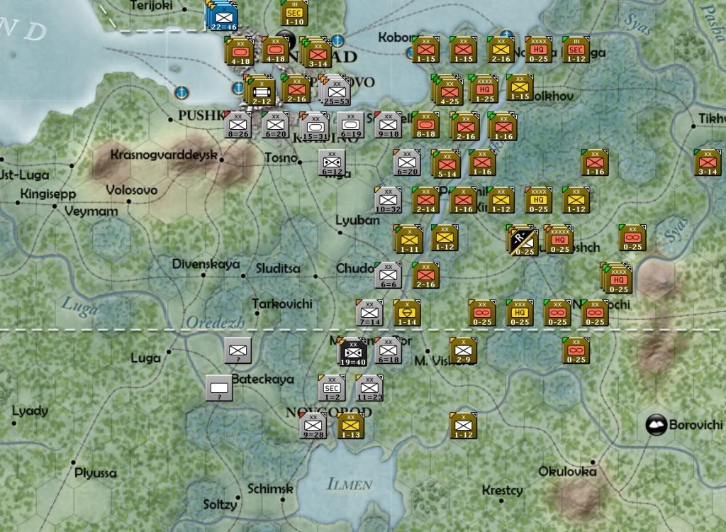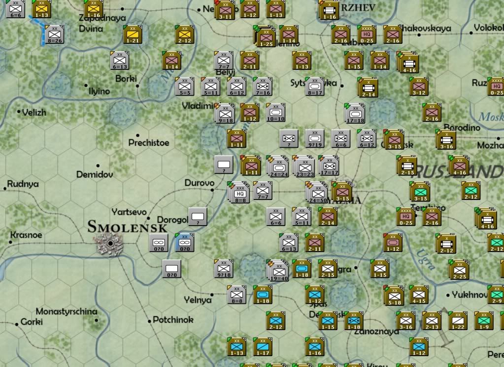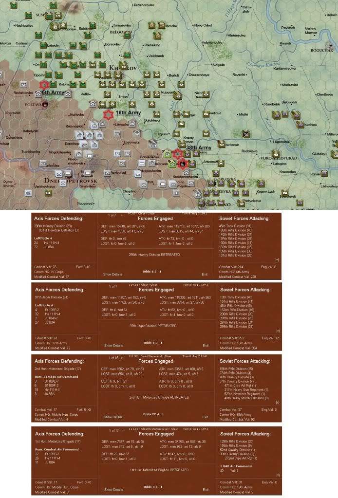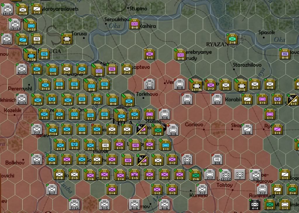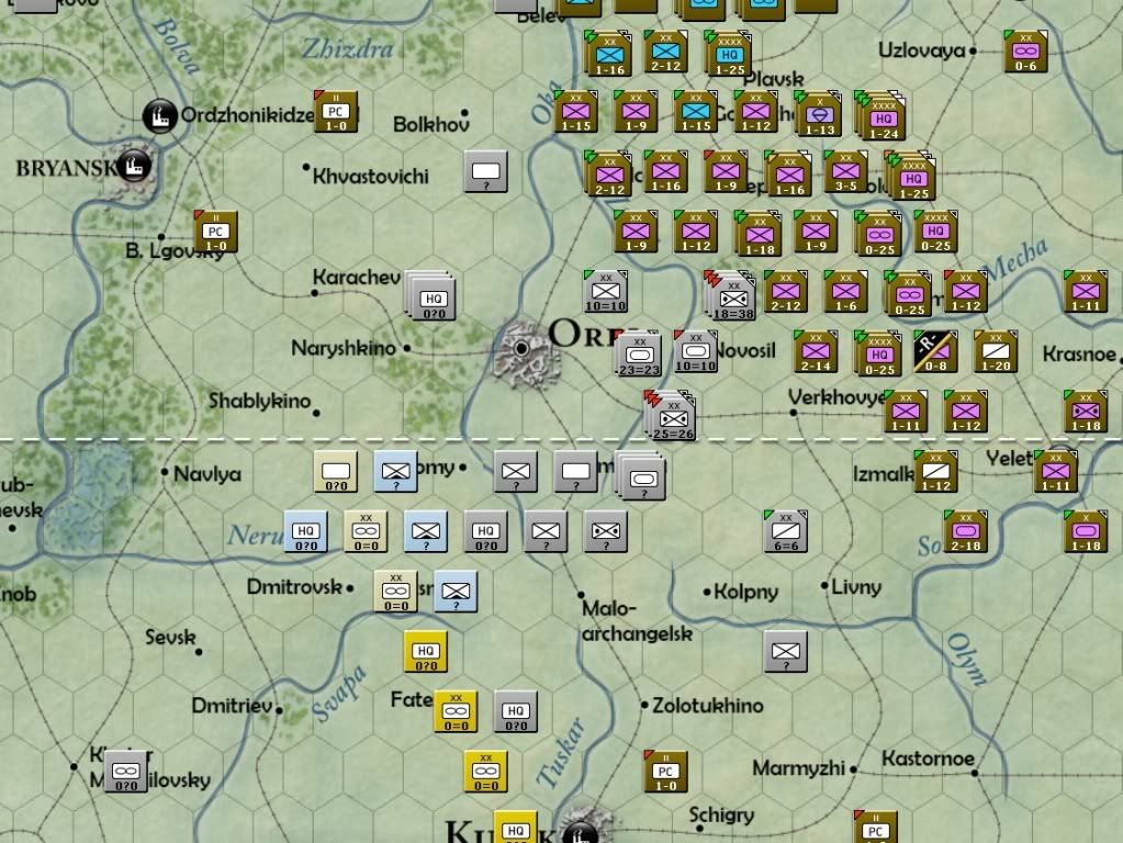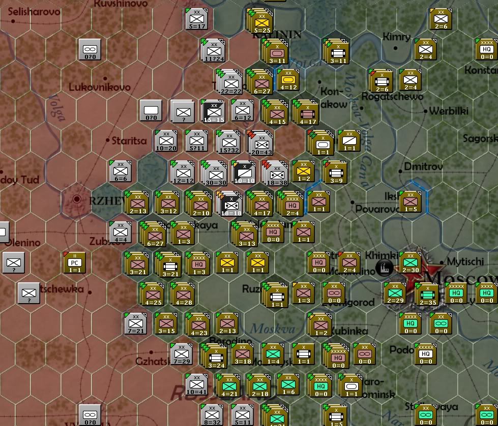 Week 10- Darkened Skies The battle for Leningrad is complete as the Red Army forces surrender the city. Losses are 2 tank divisions, 6 rifle divisions and 2 Naval Infantry brigades consisting of 89,997 men/ 1,200 artillery/517 AFVs. With the battle over, Northern Front conducts an organized withdrawal east. Northwest Front pulls back in places to the east as well. 27th Army is farthest north on the flank of Northern Front while 8th Army occupies positions in the Valdai Hills. 11th and 22nd Armies occupy the Rzhev sector, tied in with Reserve Front. Vostrukhov’s 22nd launches an attack against the 106th Infantry Division that is 10 miles southwest of Rzhev. It is forced back. In the area of Reserve Front at the Rzhev-Kaluga Line, the German 79th Division sees significant action. First it had participated in a failed attack to dislodge the 288th Rifle Division. A second effort succeeded before Golikov’s 31st Army counterattacked with nine divisions. The 79th managed to hold its position, inflicting major casualties. Undeterred, Zhukov sent in another nine divisions under Rodion Malinovsky’s 30th Army, forcing the Germans to withdraw. Farther to the south, Tolbukhin’s 20th Army (STAVKA) attacks with eight divisions, forcing the 35th Infantry Division to pull back. Western Front has one attack take place, 10 miles southeast of Spas Demensk, with 13th Army committing eight divisions that drives the 131st Infantry Division back. In the area of Southwestern Front, the situation is largely a disaster as virtually the entire front is pocketed, albeit temporarily. In a major push, an estimated five panzer and three motorized divisions attack 60 miles west of Kursk. Two of the panzer divisions, the 7th and 20th had been the same units from 3. PanzerGruppe earlier supporting the drive to Leningrad. Also identified in this force are elements of 4. PanzerGruppe. Another five panzer divisions slash north along the Kharkov-Belgorod axis to meet up with the northern pincer. Later in the week, elements of Southwestern Front force an opening to the east with local attacks concentrated north of Kharkov, but this is expected to be only a short reprieve. Admin notes K. Rokossovsky of 24th Army promoted to General–Leytenant I. Kopets (Air Value 3) of Western Air Command is arrested and executed. He is replaced by I. Zatevakhin (Air Value 2). I need to have a talk with chief of the personnel assignments bureau of the Red Air Force.
