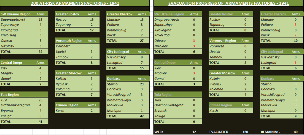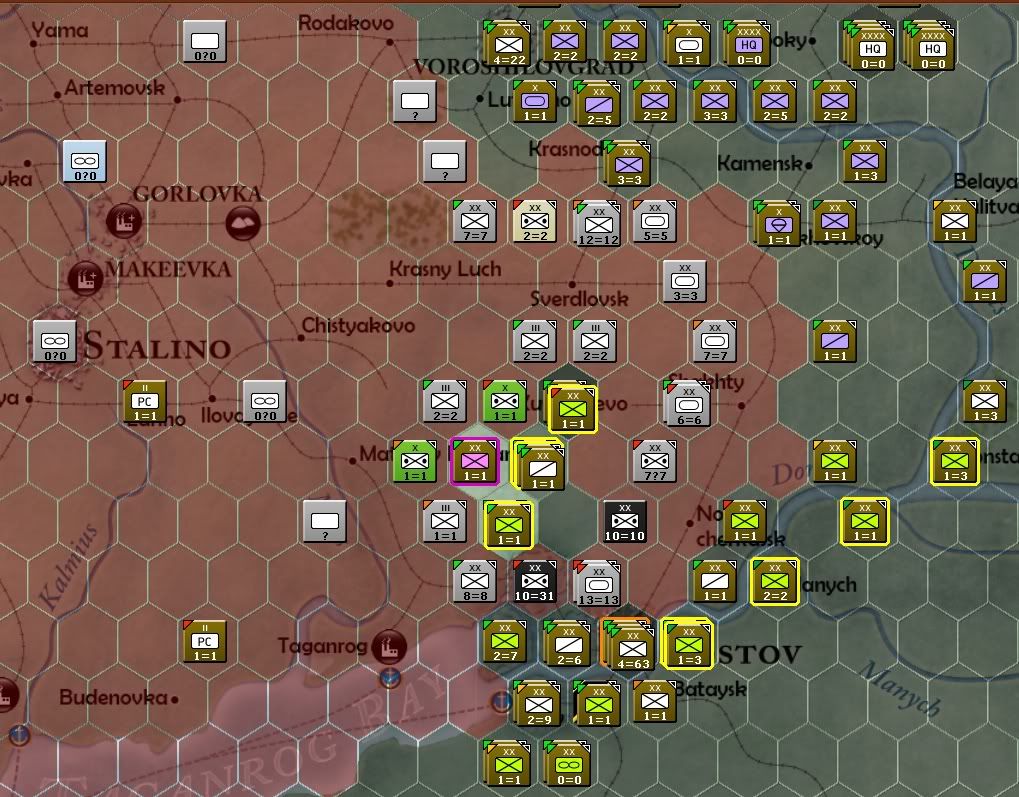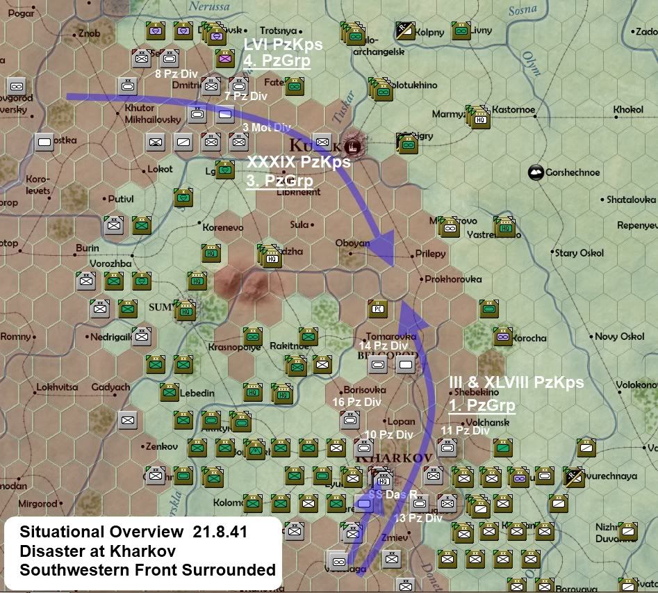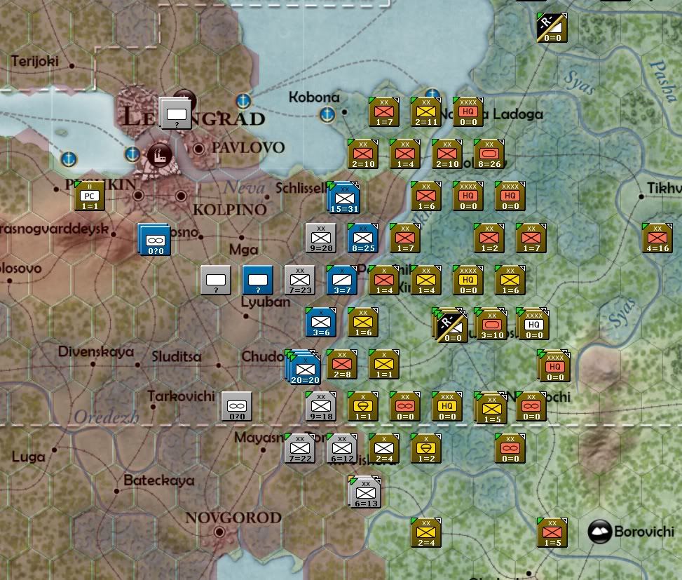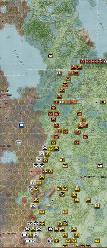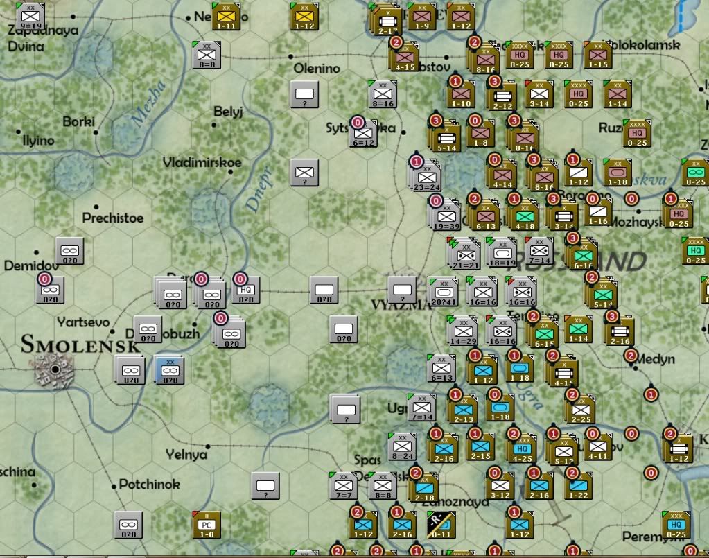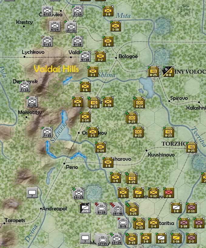 Week 10- Darkened Skies The battle for Leningrad is complete as the Red Army forces surrender the city. Losses are 2 tank divisions, 6 rifle divisions and 2 Naval Infantry brigades consisting of 89,997 men/ 1,200 artillery/517 AFVs. With the battle over, Northern Front conducts an organized withdrawal east. Northwest Front pulls back in places to the east as well. 27th Army is farthest north on the flank of Northern Front while 8th Army occupies positions in the Valdai Hills. 11th and 22nd Armies occupy the Rzhev sector, tied in with Reserve Front. Vostrukhov’s 22nd launches an attack against the 106th Infantry Division that is 10 miles southwest of Rzhev. It is forced back. In the area of Reserve Front at the Rzhev-Kaluga Line, the German 79th Division sees significant action. First it had participated in a failed attack to dislodge the 288th Rifle Division. A second effort succeeded before Golikov’s 31st Army counterattacked with nine divisions. The 79th managed to hold its position, inflicting major casualties. Undeterred, Zhukov sent in another nine divisions under Rodion Malinovsky’s 30th Army, forcing the Germans to withdraw. Farther to the south, Tolbukhin’s 20th Army (STAVKA) attacks with eight divisions, forcing the 35th Infantry Division to pull back. Western Front has one attack take place, 10 miles southeast of Spas Demensk, with 13th Army committing eight divisions that drives the 131st Infantry Division back. In the area of Southwestern Front, the situation is largely a disaster as virtually the entire front is pocketed, albeit temporarily. In a major push, an estimated five panzer and three motorized divisions attack 60 miles west of Kursk. Two of the panzer divisions, the 7th and 20th had been the same units from 3. PanzerGruppe earlier supporting the drive to Leningrad. Also identified in this force are elements of 4. PanzerGruppe. Another five panzer divisions slash north along the Kharkov-Belgorod axis to meet up with the northern pincer. Later in the week, elements of Southwestern Front force an opening to the east with local attacks concentrated north of Kharkov, but this is expected to be only a short reprieve. Admin notes K. Rokossovsky of 24th Army promoted to General–Leytenant I. Kopets (Air Value 3) of Western Air Command is arrested and executed. He is replaced by I. Zatevakhin (Air Value 2). I need to have a talk with chief of the personnel assignments bureau of the Red Air Force.
