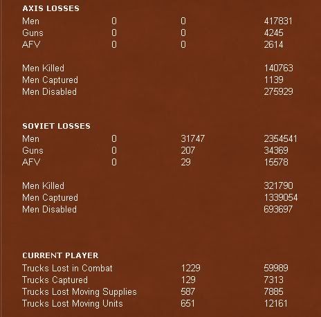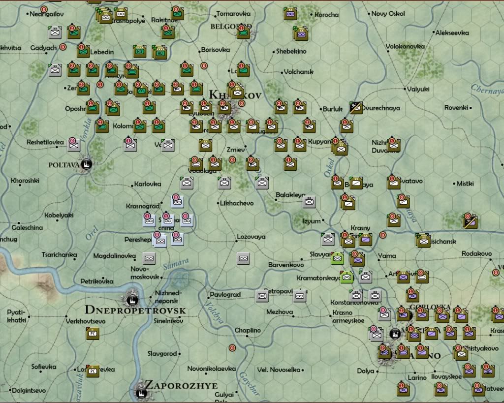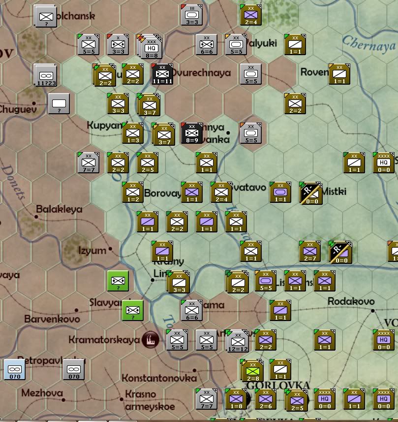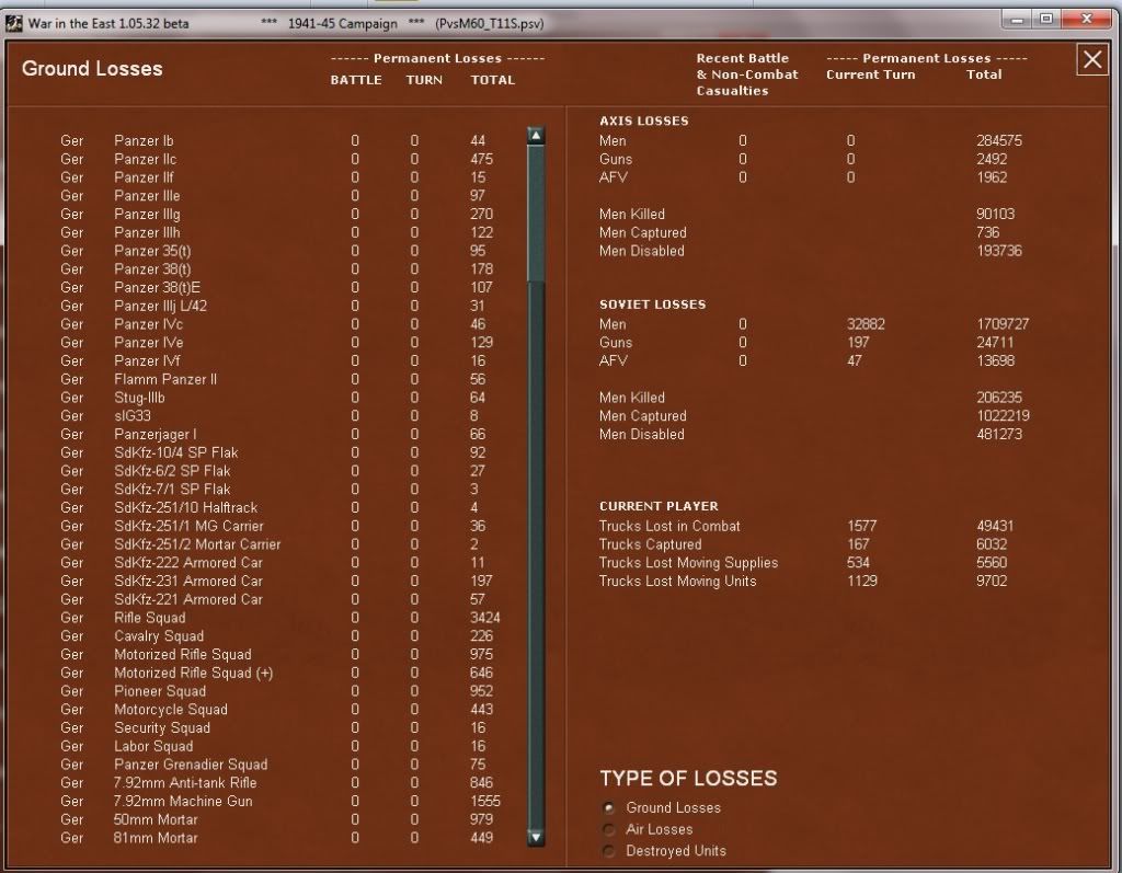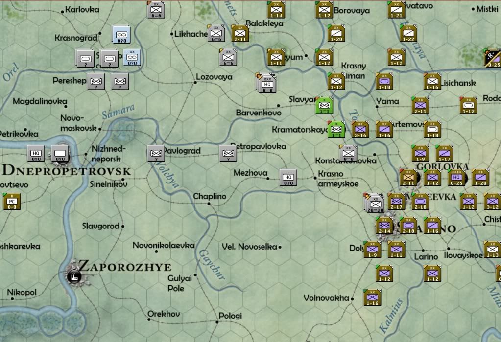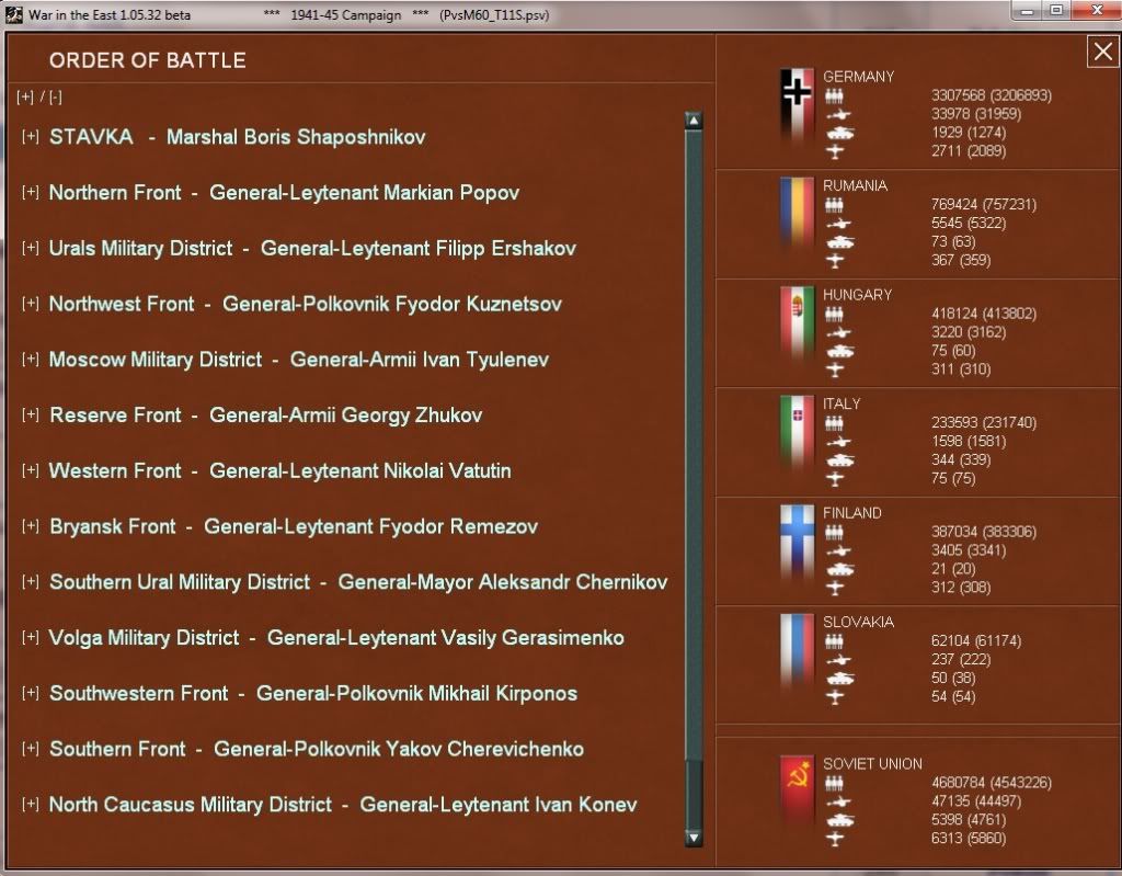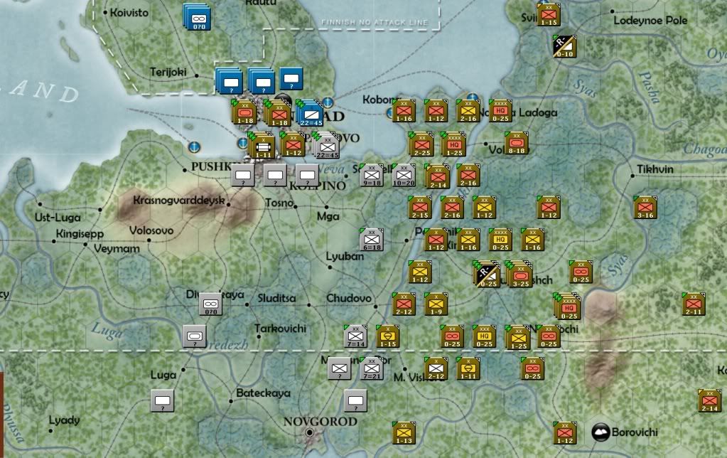 Week 10- Darkened Skies The battle for Leningrad is complete as the Red Army forces surrender the city. Losses are 2 tank divisions, 6 rifle divisions and 2 Naval Infantry brigades consisting of 89,997 men/ 1,200 artillery/517 AFVs. With the battle over, Northern Front conducts an organized withdrawal east. Northwest Front pulls back in places to the east as well. 27th Army is farthest north on the flank of Northern Front while 8th Army occupies positions in the Valdai Hills. 11th and 22nd Armies occupy the Rzhev sector, tied in with Reserve Front. Vostrukhov’s 22nd launches an attack against the 106th Infantry Division that is 10 miles southwest of Rzhev. It is forced back. In the area of Reserve Front at the Rzhev-Kaluga Line, the German 79th Division sees significant action. First it had participated in a failed attack to dislodge the 288th Rifle Division. A second effort succeeded before Golikov’s 31st Army counterattacked with nine divisions. The 79th managed to hold its position, inflicting major casualties. Undeterred, Zhukov sent in another nine divisions under Rodion Malinovsky’s 30th Army, forcing the Germans to withdraw. Farther to the south, Tolbukhin’s 20th Army (STAVKA) attacks with eight divisions, forcing the 35th Infantry Division to pull back. Western Front has one attack take place, 10 miles southeast of Spas Demensk, with 13th Army committing eight divisions that drives the 131st Infantry Division back. In the area of Southwestern Front, the situation is largely a disaster as virtually the entire front is pocketed, albeit temporarily. In a major push, an estimated five panzer and three motorized divisions attack 60 miles west of Kursk. Two of the panzer divisions, the 7th and 20th had been the same units from 3. PanzerGruppe earlier supporting the drive to Leningrad. Also identified in this force are elements of 4. PanzerGruppe. Another five panzer divisions slash north along the Kharkov-Belgorod axis to meet up with the northern pincer. Later in the week, elements of Southwestern Front force an opening to the east with local attacks concentrated north of Kharkov, but this is expected to be only a short reprieve. Admin notes K. Rokossovsky of 24th Army promoted to General–Leytenant I. Kopets (Air Value 3) of Western Air Command is arrested and executed. He is replaced by I. Zatevakhin (Air Value 2). I need to have a talk with chief of the personnel assignments bureau of the Red Air Force.
