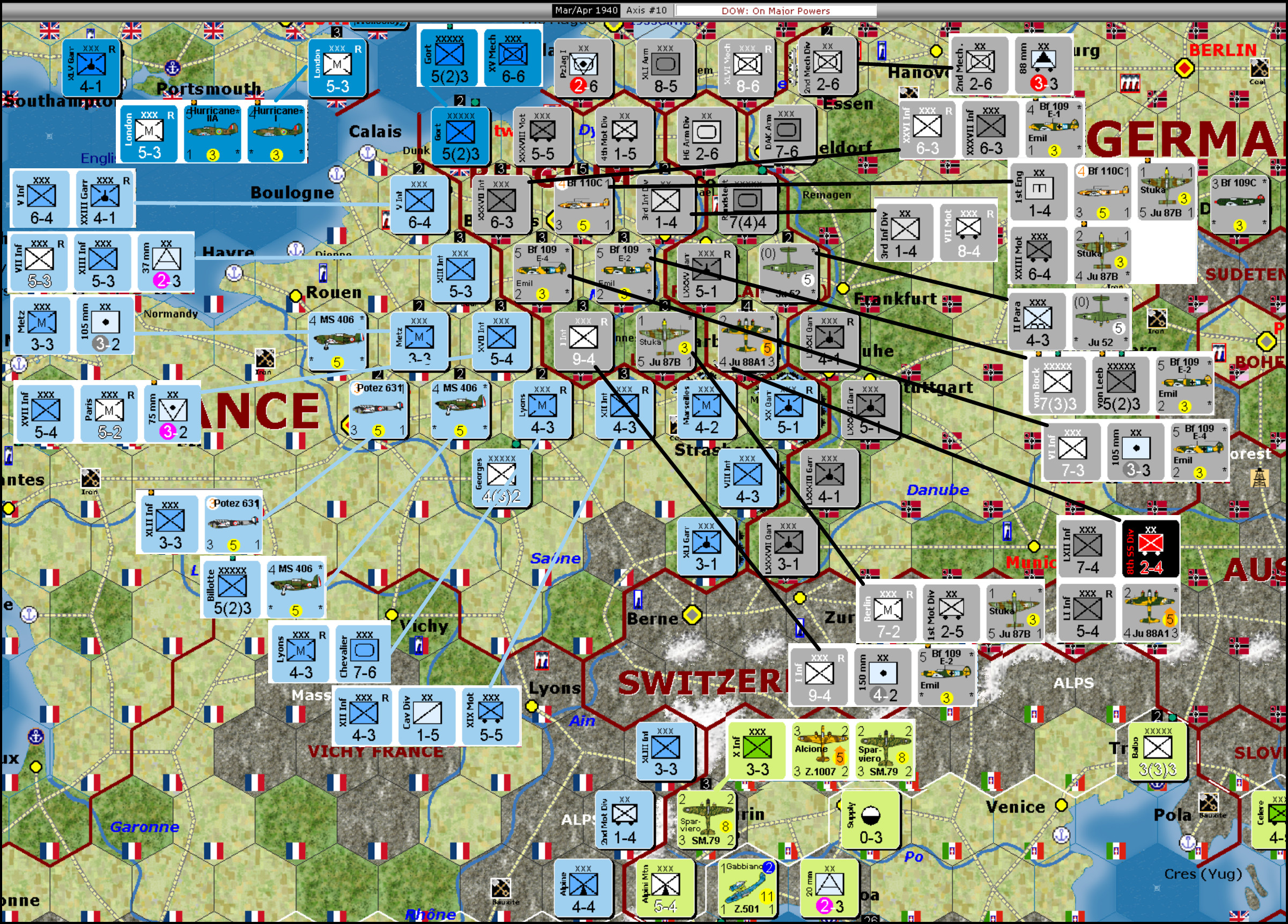 What happened here? The Germans had an excellent position in Belgium at the start of Mar/Apr 1940. Even though the Allies won the initiative and moved first in that turn, and the first 3 weather rolls were poor, Germany was ready to attack once the weather turned fine. Although it was only the 4th turn of the game, Germany had enough armor/mechanized corps and divisions to optimize a Blitz attack, albeit only against 1 hex. Reinforcements in the May/June turn were 2 more mechanized corps, an armor HQ, 2 Stukas, and a good fighter/bomber. All 6 of those units were crucial to the 4 successful attacks in the turn leading to the capture of Paris. Prudently, no unnecessary attacks were made by the Axis. By the end of the turn, the Axis losses were negligible - unless you count the expenditure of the O-chit.