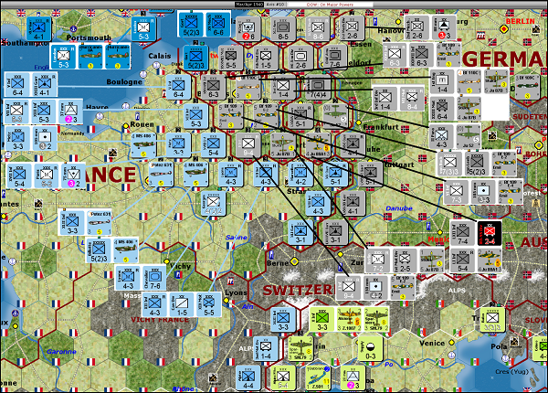 At this point I had Italy DOW France (not the Commonwealth). That let the 3 bombers in northwestern Italy (refer back to Figure 1-1) fly ground strikes against the French units in and around Paris. Due to surprise, neither the French nor the British could interfere with those ground strike missions and the effectiveness of each bomber was doubled. Each of those attacks had a poor chance of success, but there were a lot of them. Many failed, but not all.