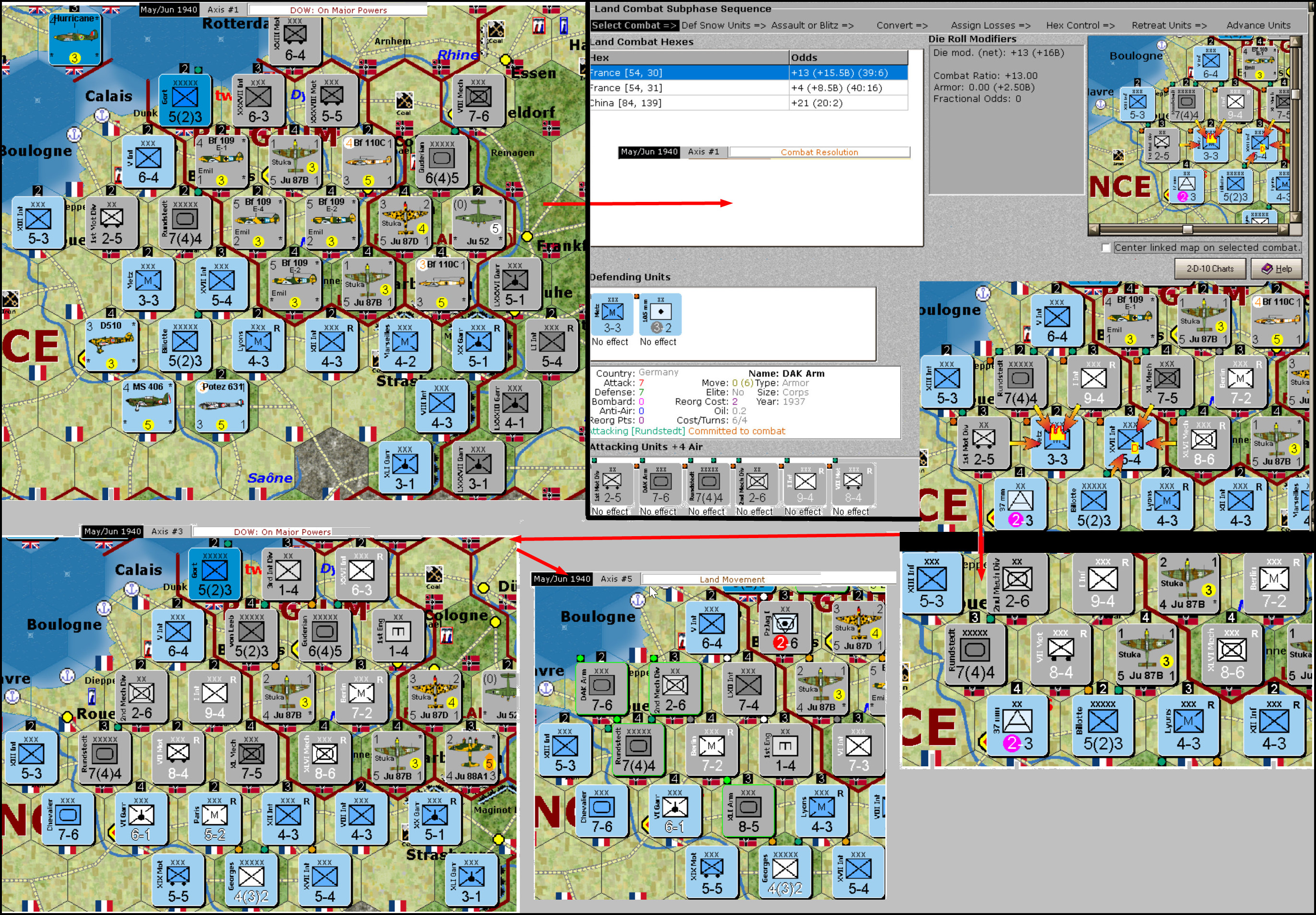 The next picture, (Figure 1-2) is a collection of screenshots. The time line starts in the upper left, (May/June 1940, impulse #1, Axis DOW on Majors), then goes to the upper right (May/June 1940, impulse #1, Axis Combat Resolution), then down to the lower right (May/June 1940, impulse 1, Axis Air Rebase done), over to the lower left (May/June 1940, impulse #3, Axis DOW on Majors), and ends in the bottom center (May/June 1940, impulse 5, Axis Land Movement done).