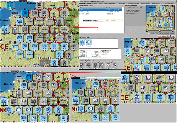 Given that it is May/June, the Fine weather in the North Temperate weather zone was to be expected. The upper right screenshot, with magnified insert, shows the two German attacks in May/June impulse #1, which are quite nice. Both the +15 DRM and the +8 DRM on the Blitz table succeeded. There was no advance two hexes because G has a solid secondary line. In the lower right corner is the position after the advance after combat and rebasing a German Stuka to the front line.