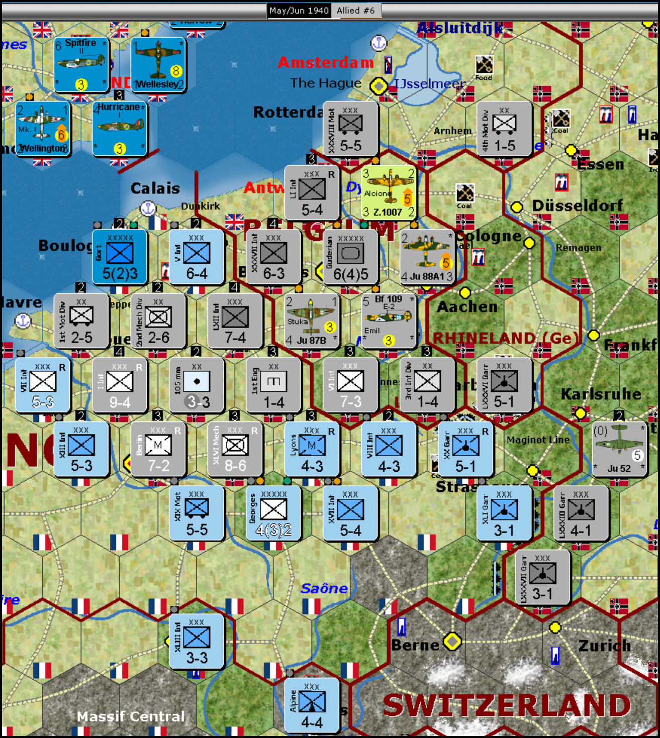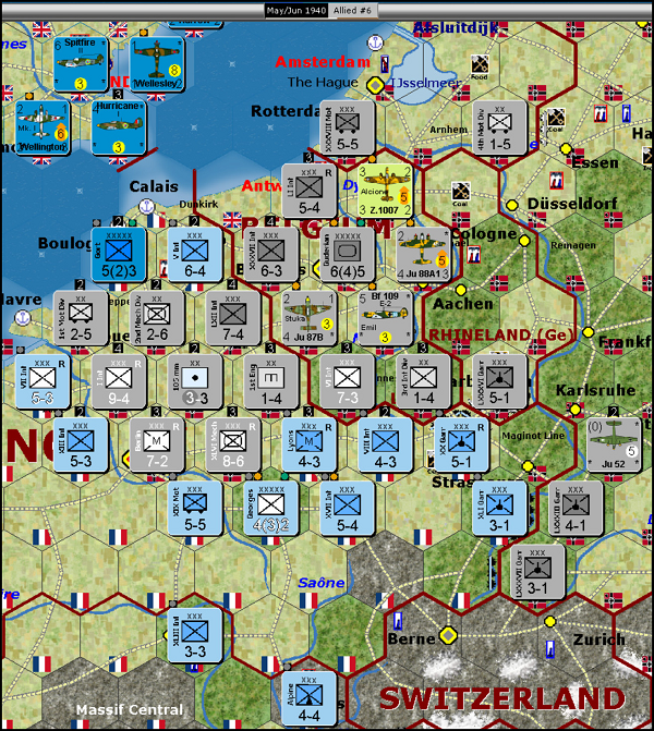 The French are down to 3 air units, all of which are still available to fly this turn. Note that very few land units are disorganized. Exceptions are 2 of the 3 German HQs. They used their reorganization points to reorganize units in their front line that had been successfully ground struck by British bombers.