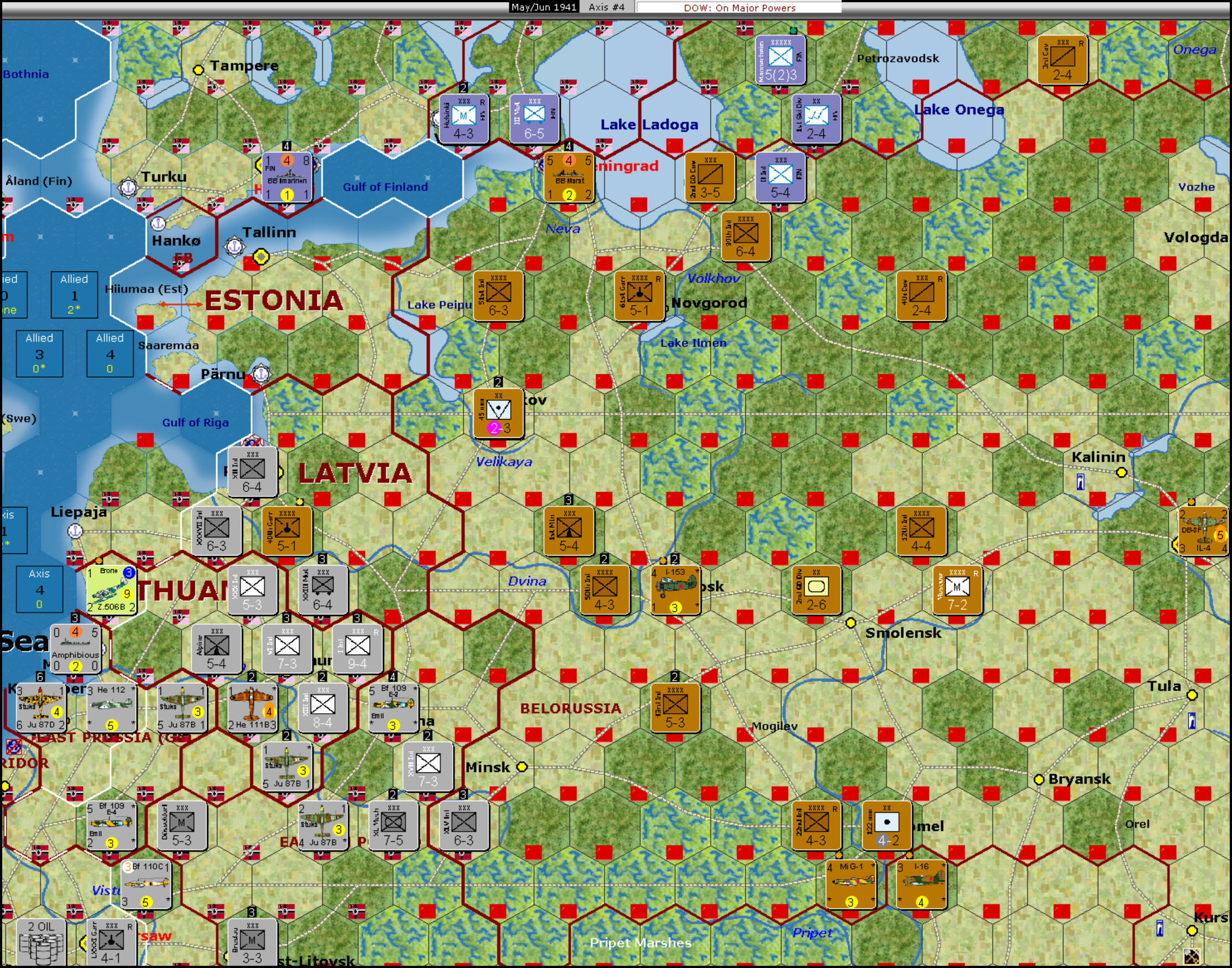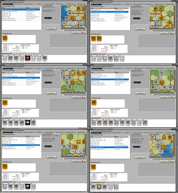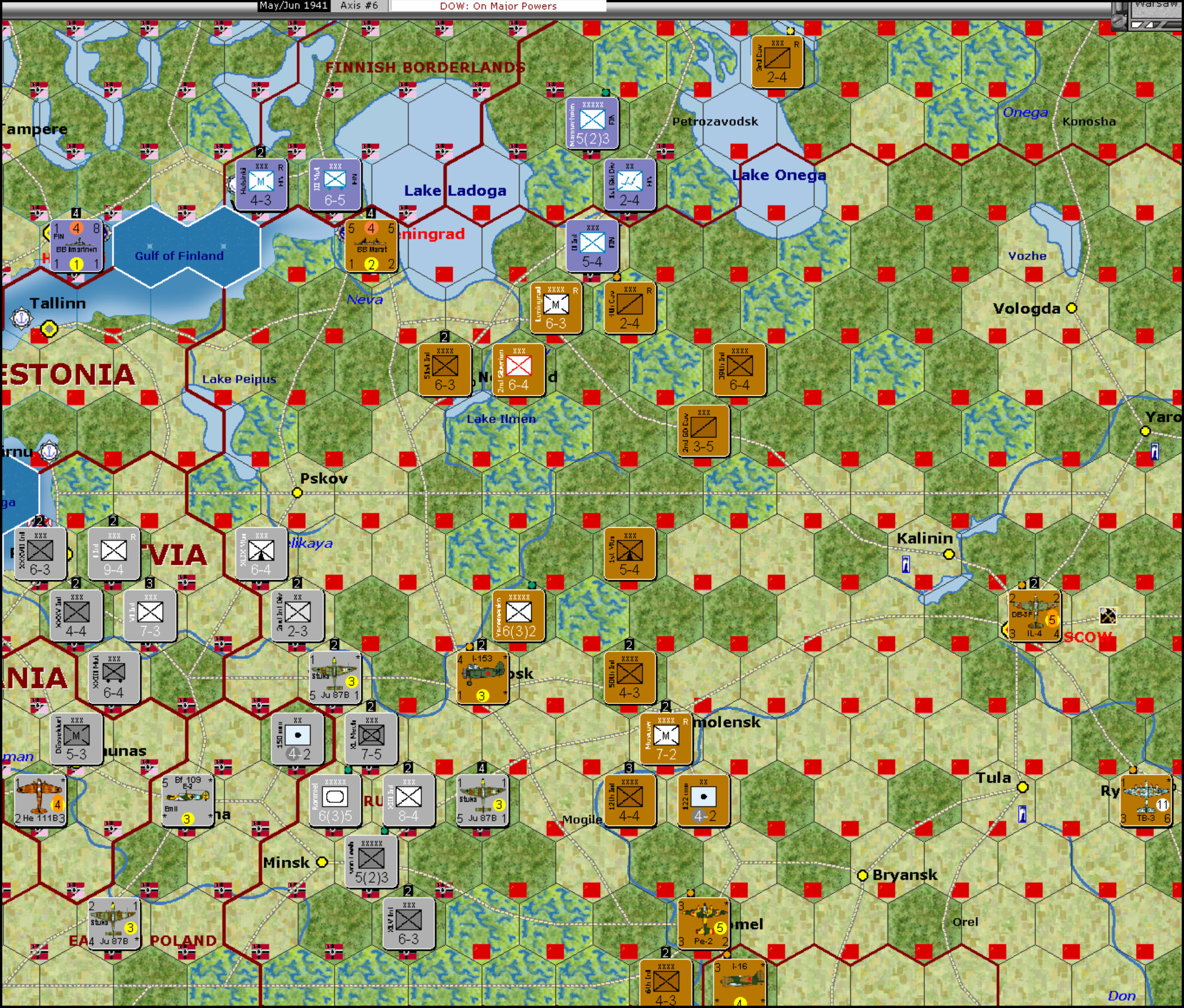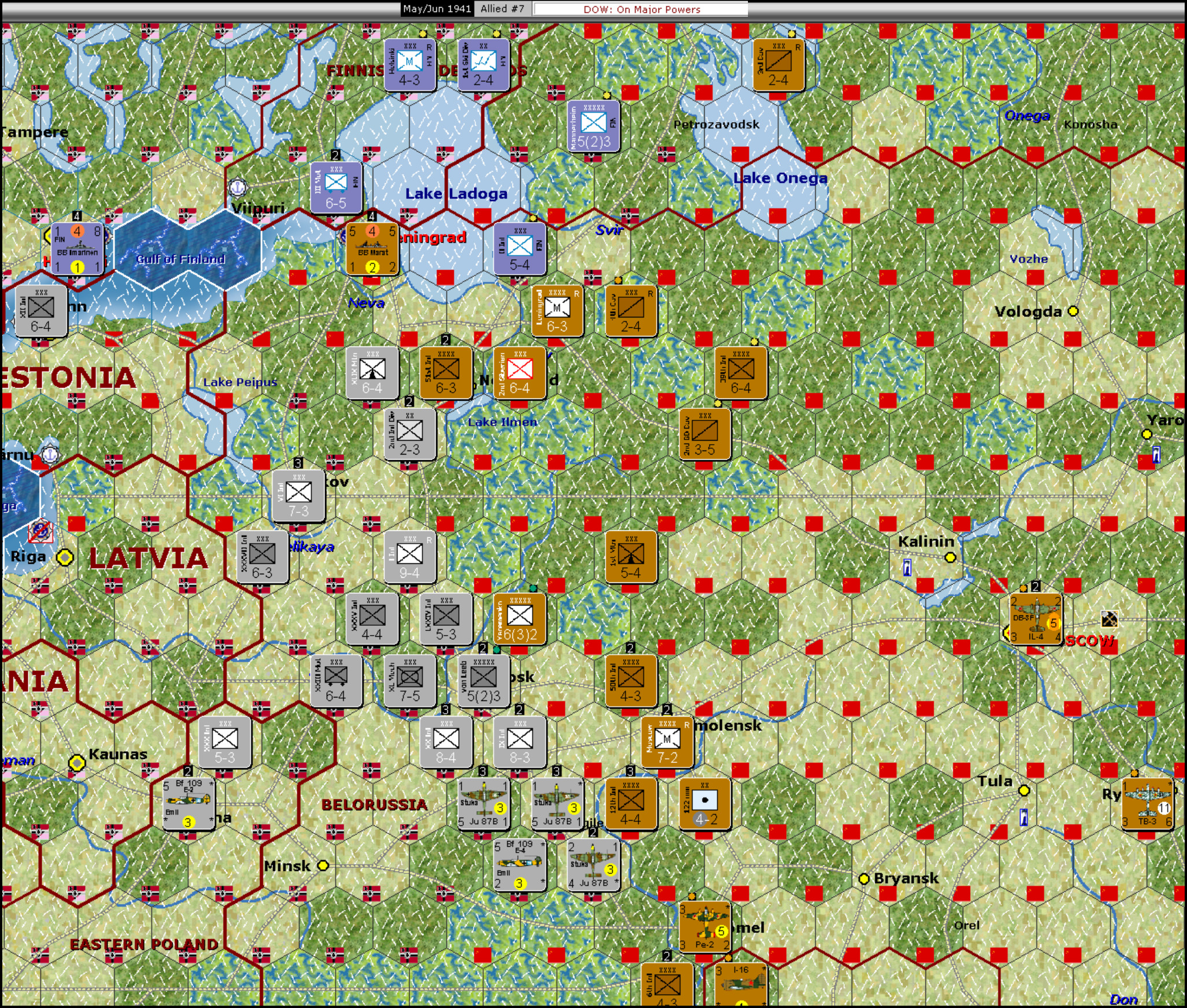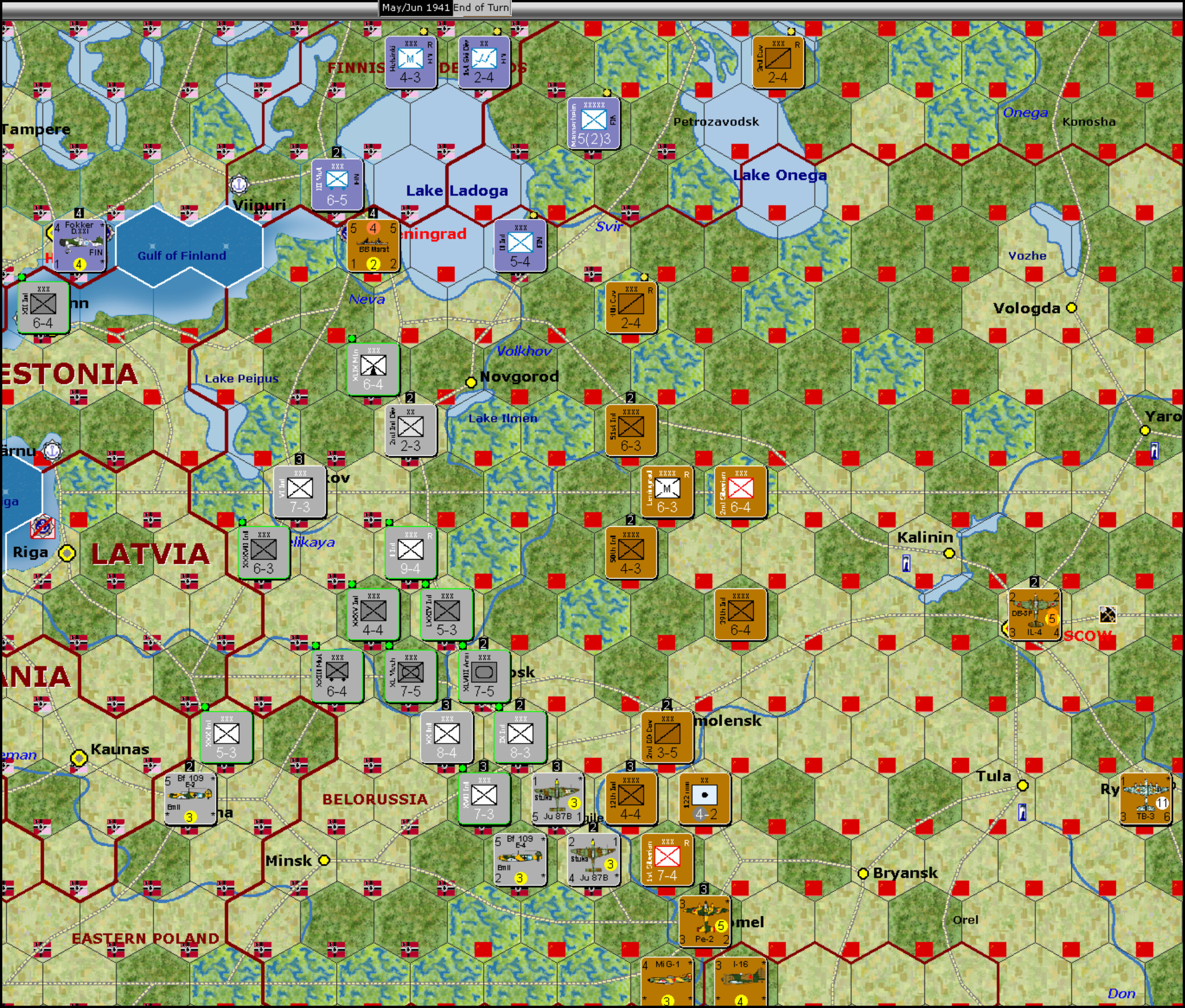 Chapter 7 Barbarossa Attacks Attacks in Mar/Apr 1941 This post covers land combat in Russia in the last impulse of Mar/Apr 1941 and the entire May/June 1941 turns. As such, it shows all 6 land attacks by Germany against the USSR in that initial impulse of Barbarossa. The turn ended immediately thereafter. Picking up the thread, the story then continues with the Allied and Axis impulses in May/June 1941 through to that turn’s conclusion. Figure 7-1 displays all 6 German land combats in impulse #11 of Mar/Apr 1941. Each of the Land Combat Resolution forms lists all the combats in the upper left, with one of them selected/highlighted. The selected hex is shown in the small insert detailed map. At the bottom of the form, the defending and attacking units involved in the combat are displayed separately. A few of the combats have air units providing ground support, which appear as +XX Air above the attacking unit depictions. Look at the top center of the 6 Land Combat Resolution forms in the figure. Directly under the bold text Die Roll Modifiers is the net/final die roll modifier for the selected combat. The 6 German attacks were all at excellent odds, as is to be expected in Fine weather during the surprise impulse following a declaration of war. +21 is guaranteed success: all the defenders are destroyed, none of the attackers are harmed in the least, and the advance after combat is 1 or 2 hexes. The latter only happens when the Blitz combat result table is chosen. Four attacks were at +21. There were two lesser attacks: +18 on Kaunas (upper right corner of the figure) and a +20 blitz on hex [54, 53] (lower left corner). A +18 is guaranteed to take Kaunas since there are only 2 defending units in the hex. Likewise the +20 blitz will get a B* result, killing off the sole defender in that hex. The attacking armor and mechanized units will then be able to advance 2 hexes, overrunning and destroying the 1-4 Russian division to the northeast of the attacked hex. The 7th attack listed in each of the 6 screenshots is the feeble invasion by the Italians on Port Said - it failed. The North May/June 1941 As stated above, the turn then ended (50% probability). The Allies won the initiative and chose to move first in the next turn. Figure 7-2 shows where they retreated in the north. The position is for Axis to move in the second impulse of the May/June 1941 turn. 5 Russian corps are blocking the Finns in the north from moving any further south. Actually, the supply line for the Finnish HQ (Mannerheim) is already stretched to its limit (4 hexes to a rail line connected to Helsinki). The two other Finns near the Finnish HQ could wander 4 hexes from the HQ and still be in supply, if the path were not interrupted by Russian units or their ZOCs. The general German advance from the bottom left of the screenshot to the north and east, was halted by three Russian controlled hexes: next to Riga, Vilna, and Minsk. Although the Russian bomber alone in the hex can be overrun, it will merely rebase up to 30 hexes away. G would have done that already if not for the limit on how many air missions (3) he could fly during a Land Action. Other Russian units are scurrying to the rear, getting out of range of the German bombers whenever possible. Continuing the narrative of what happened in the north, Figure 7-3 shows the Allies to move in impulse #3. There is a strip of land to the west of Riga (at the time, G said he was aware of this; but now he is not sure if he was) which let the German units avoid the ZOC of the Russian corps and move into Riga from the hex to its west. Like Kaunas, Riga is the capital of a minor country and gaining control of it by the end of the turn will liberate those countries. Tallinn is the third of the Baltic States and Germany hopes to capture that this turn, completing the liberation of the set of three: Lithuania, Latvia, and Estonia. They will then be aligned to Germany and their capitals will act as secondary supply sources for German units (but not Italian or Finns). The successful assault on Vilna was the only other attack that Germany made in the previous impulse. Now the Russians intend to pull back farther. Which they did, as shown in Figure 7-4: Axis to move, impulse #4. The 5-1 garrison unit next to Riga was out of supply (small yellow circle above the unit), cut off by German ZOCs. If it had moved, it would have become disorganized, still been out of supply, and had its defensive combat strength reduced to 1. Remaining where it was left it at full strength. However, it will be destroyed by units crossing to the far side of the Dvina, so their combat factors won’t be halved when they attack. G has chosen to evacuate Minsk - not something I would have done. This was in keeping with his main goal in the north to lose as few units as possible. Any left in Minsk would have died. Two Stukas were present to perform either ground strikes or ground support with fighter protection from the Bf 109 E2. As it is, those bombers now have no one to hurt this impulse. Instead, Germany took on the 2 Russian corps in the forest hex due south of Vitebsk - without air support. There were only two hexes adjacent from which to launch that attack and though it was a blitz attack, no DRM modifiers applied. Those are only given to the attacker for blitzing a clear terrain hex which doesn’t contain a city. Onward, ever onward, to the rear. That is the USSR marching song at the beginning of the war against Germany. See Figure 7-5, Allies to move. Danger! the Stukas have rebased farther forward. Luckily for the USSR the attack in the forest south of Vitebsk had a mediocre poor result for the Axis. A German SS mechanized division was lost and half of the other attacking units became disorganized. The Russians lost both defenders from the map, but they were merely shattered and magically reappeared as reinforcements in the next turn. The Germans should have brought wooden stakes to drive through the Russ