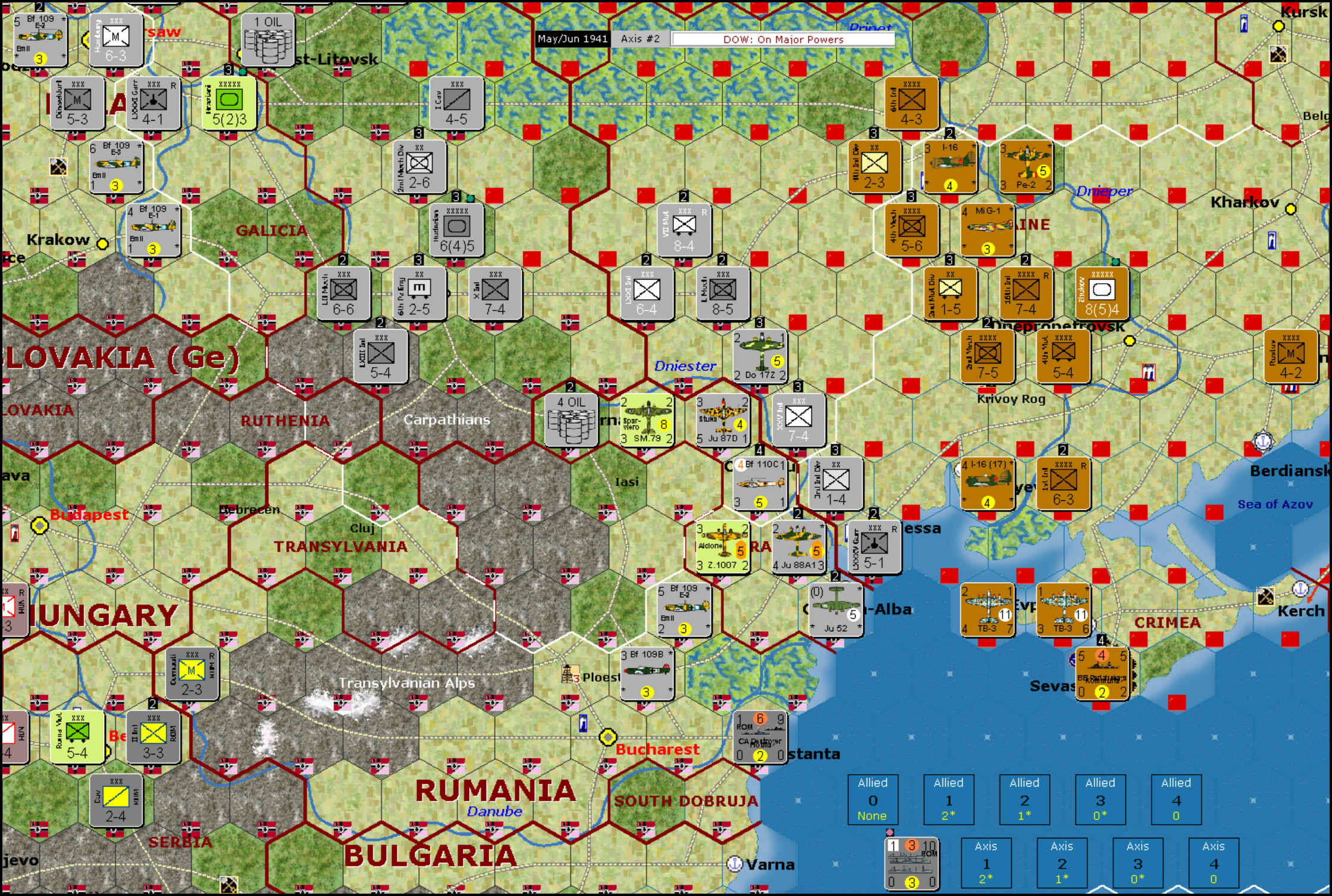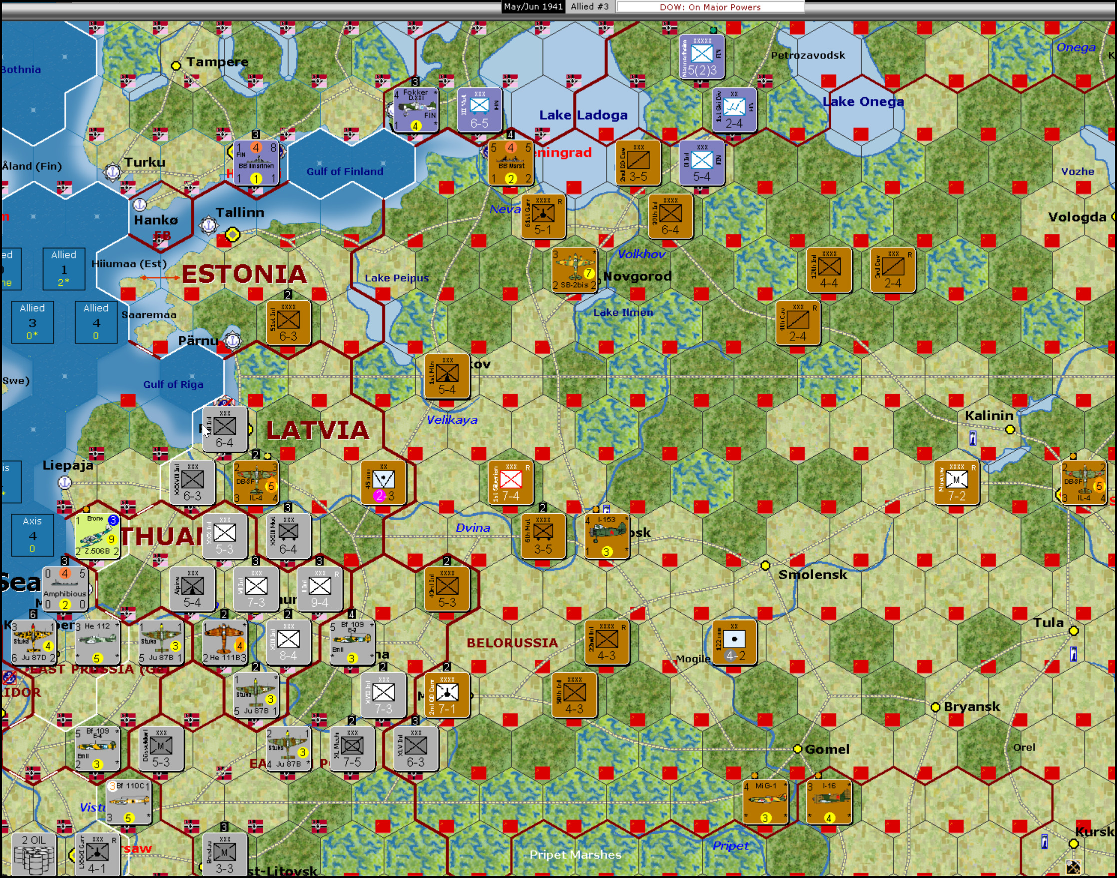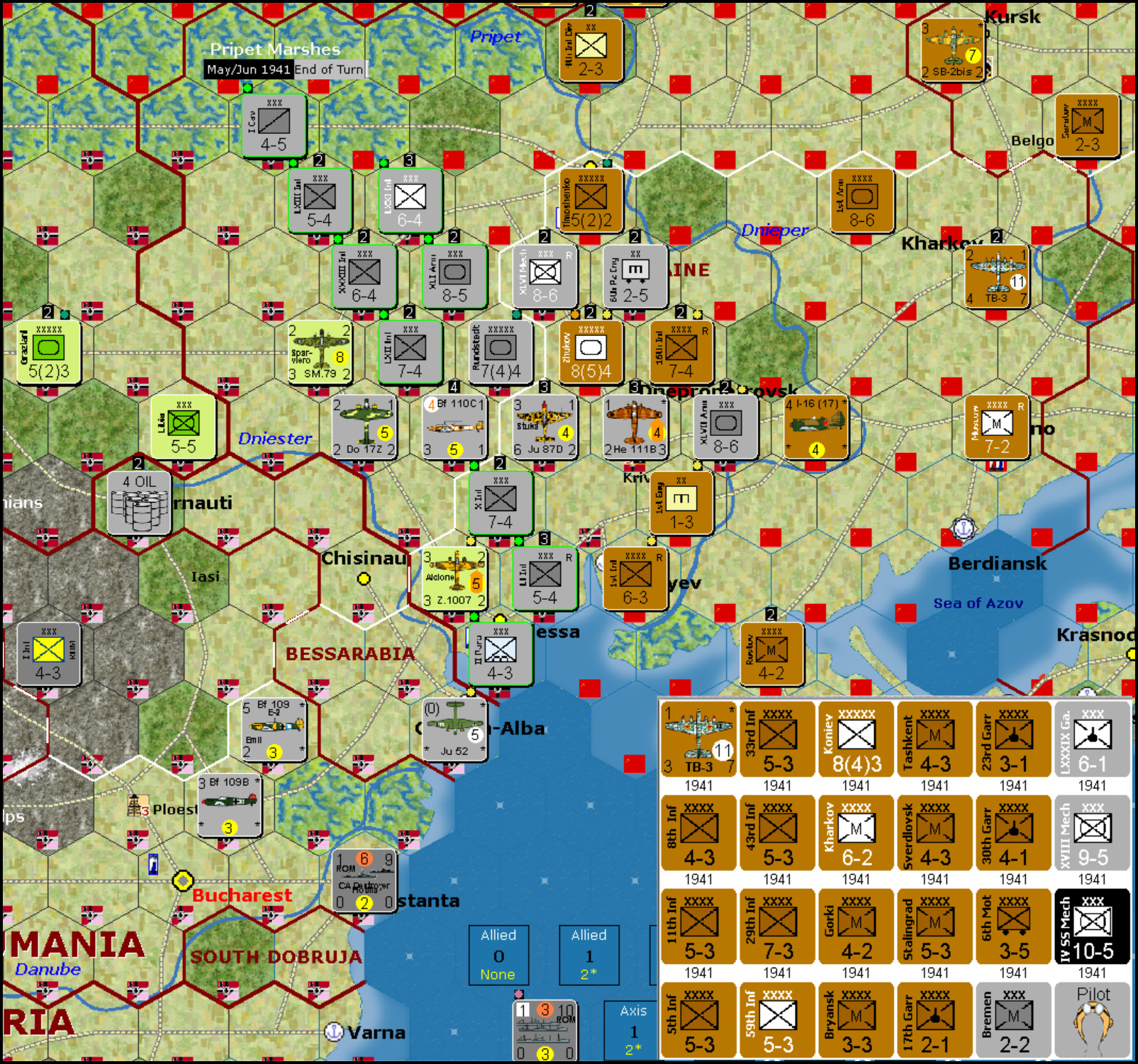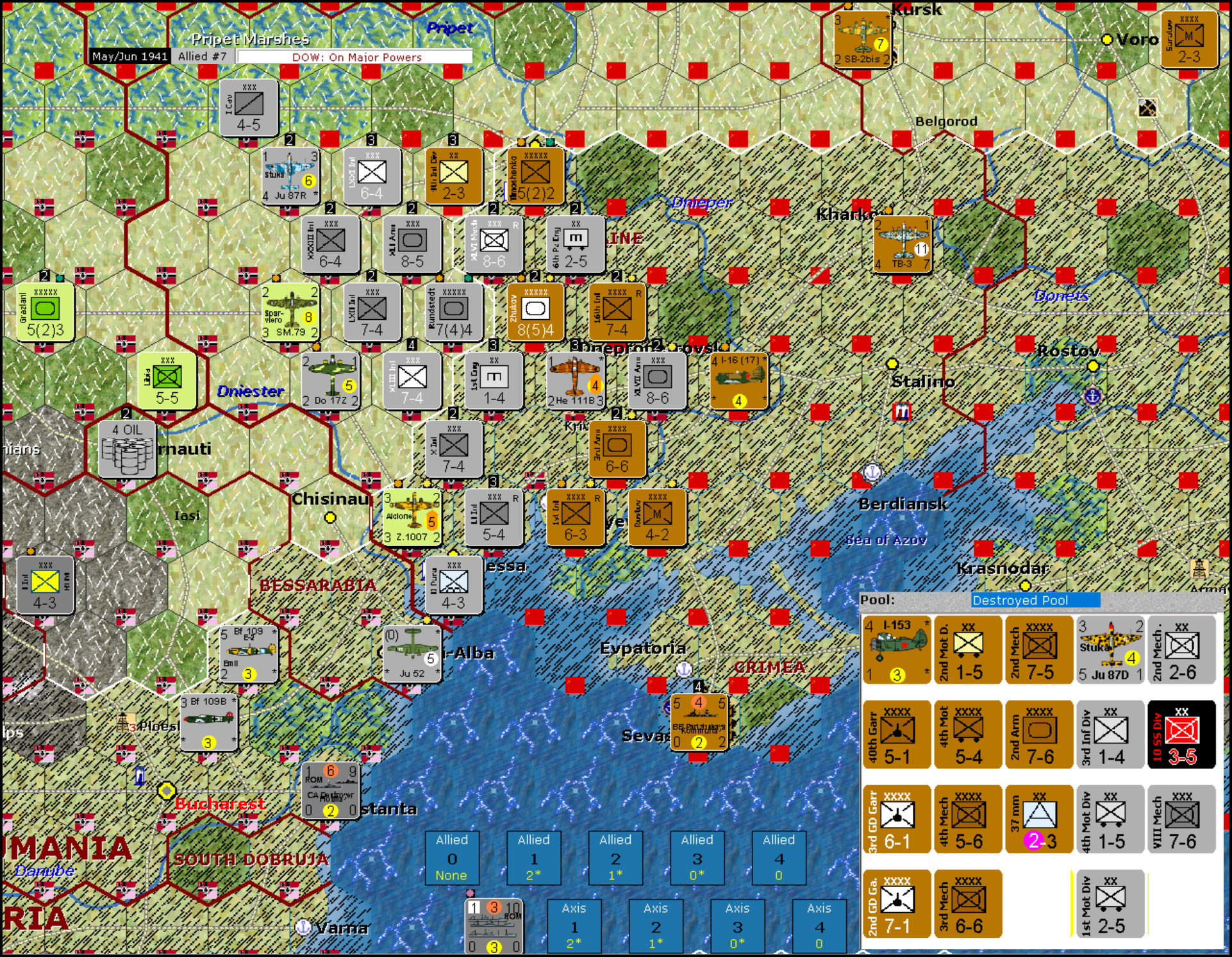 Chapter 7 Barbarossa Attacks Attacks in Mar/Apr 1941 This post covers land combat in Russia in the last impulse of Mar/Apr 1941 and the entire May/June 1941 turns. As such, it shows all 6 land attacks by Germany against the USSR in that initial impulse of Barbarossa. The turn ended immediately thereafter. Picking up the thread, the story then continues with the Allied and Axis impulses in May/June 1941 through to that turn’s conclusion. Figure 7-1 displays all 6 German land combats in impulse #11 of Mar/Apr 1941. Each of the Land Combat Resolution forms lists all the combats in the upper left, with one of them selected/highlighted. The selected hex is shown in the small insert detailed map. At the bottom of the form, the defending and attacking units involved in the combat are displayed separately. A few of the combats have air units providing ground support, which appear as +XX Air above the attacking unit depictions. Look at the top center of the 6 Land Combat Resolution forms in the figure. Directly under the bold text Die Roll Modifiers is the net/final die roll modifier for the selected combat. The 6 German attacks were all at excellent odds, as is to be expected in Fine weather during the surprise impulse following a declaration of war. +21 is guaranteed success: all the defenders are destroyed, none of the attackers are harmed in the least, and the advance after combat is 1 or 2 hexes. The latter only happens when the Blitz combat result table is chosen. Four attacks were at +21. There were two lesser attacks: +18 on Kaunas (upper right corner of the figure) and a +20 blitz on hex [54, 53] (lower left corner). A +18 is guaranteed to take Kaunas since there are only 2 defending units in the hex. Likewise the +20 blitz will get a B* result, killing off the sole defender in that hex. The attacking armor and mechanized units will then be able to advance 2 hexes, overrunning and destroying the 1-4 Russian division to the northeast of the attacked hex. The 7th attack listed in each of the 6 screenshots is the feeble invasion by the Italians on Port Said - it failed. The North May/June 1941 As stated above, the turn then ended (50% probability). The Allies won the initiative and chose to move first in the next turn. Figure 7-2 shows where they retreated in the north. The position is for Axis to move in the second impulse of the May/June 1941 turn. 5 Russian corps are blocking the Finns in the north from moving any further south. Actually, the supply line for the Finnish HQ (Mannerheim) is already stretched to its limit (4 hexes to a rail line connected to Helsinki). The two other Finns near the Finnish HQ could wander 4 hexes from the HQ and still be in supply, if the path were not interrupted by Russian units or their ZOCs. The general German advance from the bottom left of the screenshot to the north and east, was halted by three Russian controlled hexes: next to Riga, Vilna, and Minsk. Although the Russian bomber alone in the hex can be overrun, it will merely rebase up to 30 hexes away. G would have done that already if not for the limit on how many air missions (3) he could fly during a Land Action. Other Russian units are scurrying to the rear, getting out of range of the German bombers whenever possible. Continuing the narrative of what happened in the north, Figure 7-3 shows the Allies to move in impulse #3. There is a strip of land to the west of Riga (at the time, G said he was aware of this; but now he is not sure if he was) which let the German units avoid the ZOC of the Russian corps and move into Riga from the hex to its west. Like Kaunas, Riga is the capital of a minor country and gaining control of it by the end of the turn will liberate those countries. Tallinn is the third of the Baltic States and Germany hopes to capture that this turn, completing the liberation of the set of three: Lithuania, Latvia, and Estonia. They will then be aligned to Germany and their capitals will act as secondary supply sources for German units (but not Italian or Finns). The successful assault on Vilna was the only other attack that Germany made in the previous impulse. Now the Russians intend to pull back farther. Which they did, as shown in Figure 7-4: Axis to move, impulse #4. The 5-1 garrison unit next to Riga was out of supply (small yellow circle above the unit), cut off by German ZOCs. If it had moved, it would have become disorganized, still been out of supply, and had its defensive combat strength reduced to 1. Remaining where it was left it at full strength. However, it will be destroyed by units crossing to the far side of the Dvina, so their combat factors won’t be halved when they attack. G has chosen to evacuate Minsk - not something I would have done. This was in keeping with his main goal in the north to lose as few units as possible. Any left in Minsk would have died. Two Stukas were present to perform either ground strikes or ground support with fighter protection from the Bf 109 E2. As it is, those bombers now have no one to hurt this impulse. Instead, Germany took on the 2 Russian corps in the forest hex due south of Vitebsk - without air support. There were only two hexes adjacent from which to launch that attack and though it was a blitz attack, no DRM modifiers applied. Those are only given to the attacker for blitzing a clear terrain hex which doesn’t contain a city. Onward, ever onward, to the rear. That is the USSR marching song at the beginning of the war against Germany. See Figure 7-5, Allies to move. Danger! the Stukas have rebased farther forward. Luckily for the USSR the attack in the forest south of Vitebsk had a mediocre poor result for the Axis. A German SS mechanized division was lost and half of the other attacking units became disorganized. The Russians lost both defenders from the map, but they were merely shattered and magically reappeared as reinforcements in the next turn. The Germans should have brought wooden stakes to drive through the Russ