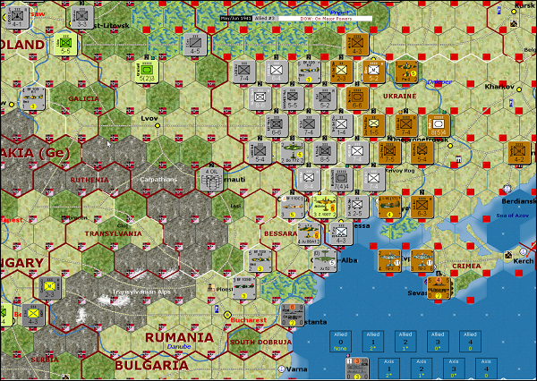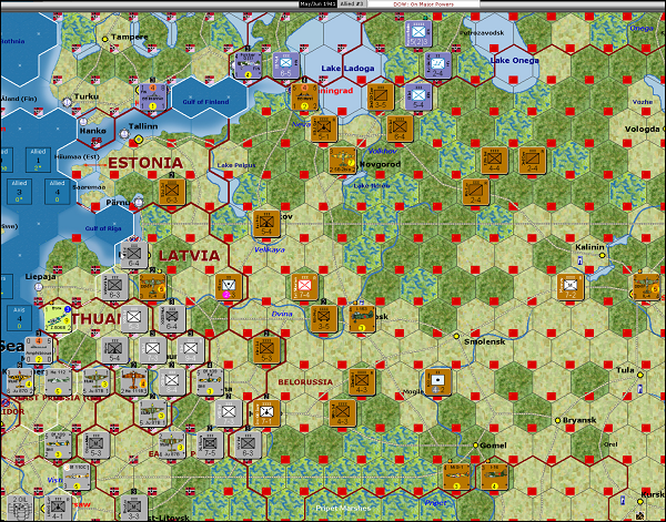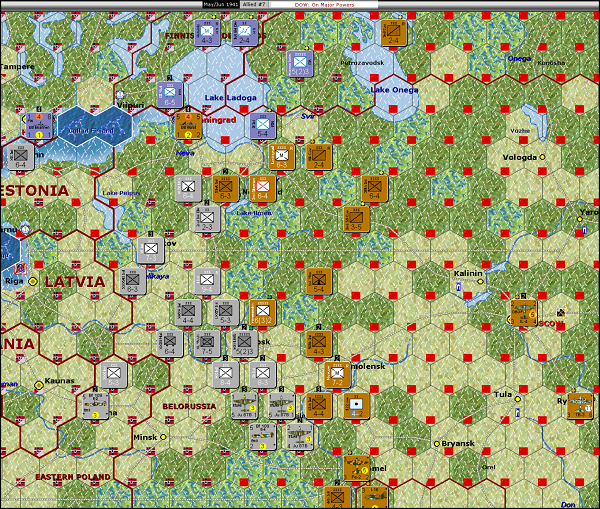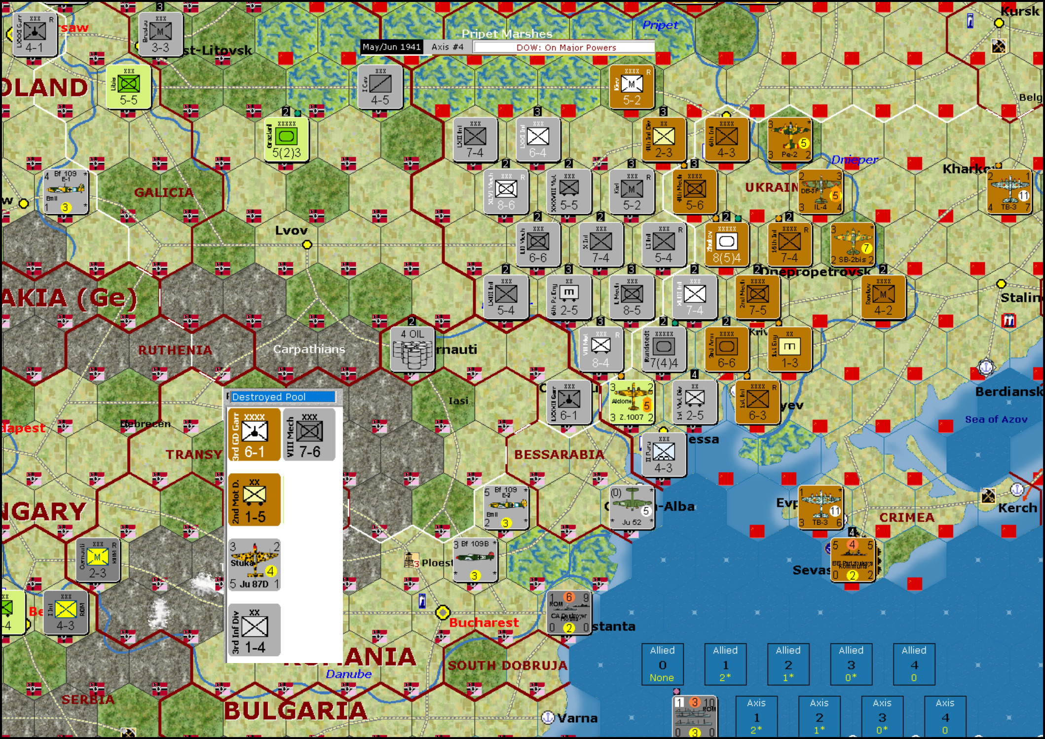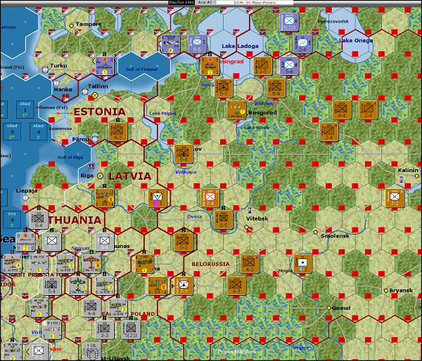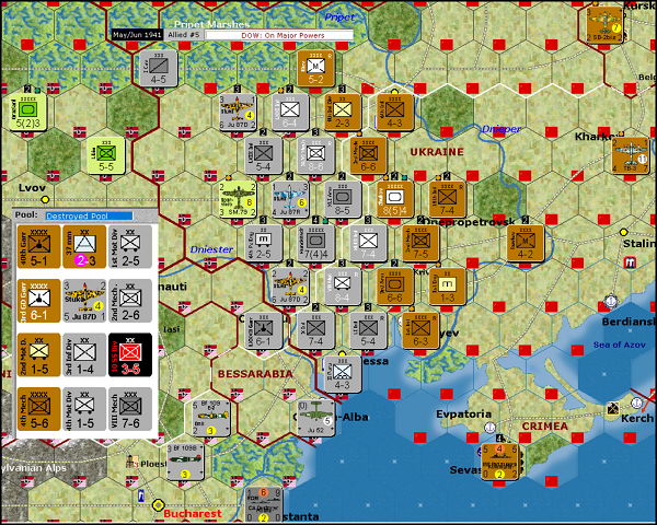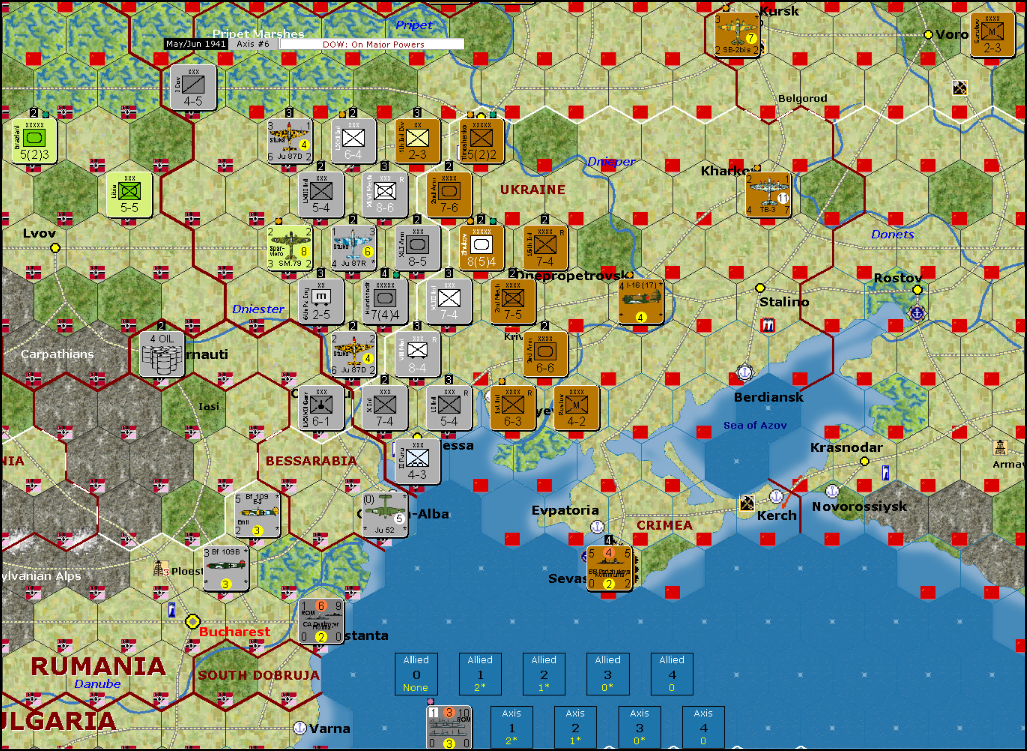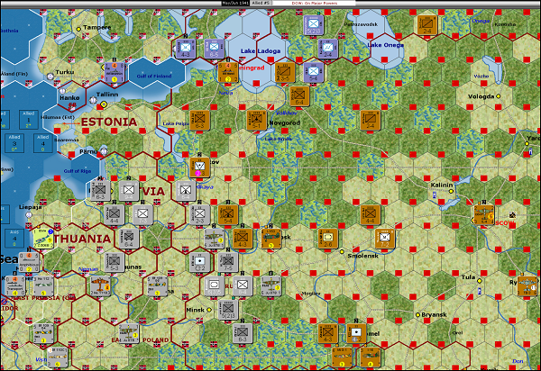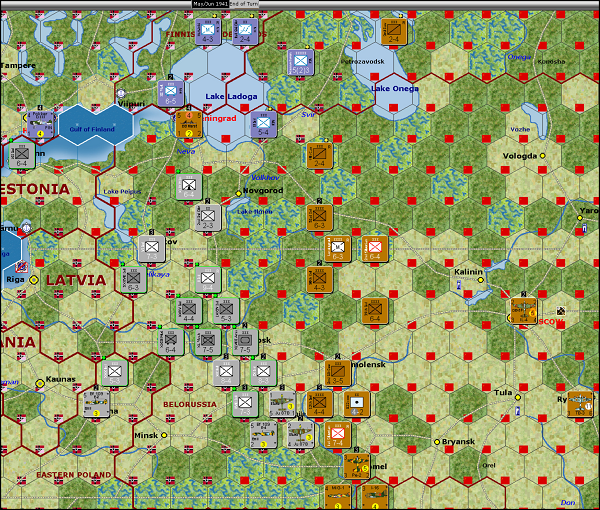 Chapter 7 Barbarossa Attacks Attacks in Mar/Apr 1941 This post covers land combat in Russia in the last impulse of Mar/Apr 1941 and the entire May/June 1941 turns. As such, it shows all 6 land attacks by Germany against the USSR in that initial impulse of Barbarossa. The turn ended immediately thereafter. Picking up the thread, the story then continues with the Allied and Axis impulses in May/June 1941 through to that turn’s conclusion. Figure 7-1 displays all 6 German land combats in impulse #11 of Mar/Apr 1941. Each of the Land Combat Resolution forms lists all the combats in the upper left, with one of them selected/highlighted. The selected hex is shown in the small insert detailed map. At the bottom of the form, the defending and attacking units involved in the combat are displayed separately. A few of the combats have air units providing ground support, which appear as +XX Air above the attacking unit depictions. Look at the top center of the 6 Land Combat Resolution forms in the figure. Directly under the bold text Die Roll Modifiers is the net/final die roll modifier for the selected combat. The 6 German attacks were all at excellent odds, as is to be expected in Fine weather during the surprise impulse following a declaration of war. +21 is guaranteed success: all the defenders are destroyed, none of the attackers are harmed in the least, and the advance after combat is 1 or 2 hexes. The latter only happens when the Blitz combat result table is chosen. Four attacks were at +21. There were two lesser attacks: +18 on Kaunas (upper right corner of the figure) and a +20 blitz on hex [54, 53] (lower left corner). A +18 is guaranteed to take Kaunas since there are only 2 defending units in the hex. Likewise the +20 blitz will get a B* result, killing off the sole defender in that hex. The attacking armor and mechanized units will then be able to advance 2 hexes, overrunning and destroying the 1-4 Russian division to the northeast of the attacked hex. The 7th attack listed in each of the 6 screenshots is the feeble invasion by the Italians on Port Said - it failed. The North May/June 1941 As stated above, the turn then ended (50% probability). The Allies won the initiative and chose to move first in the next turn. Figure 7-2 shows where they retreated in the north. The position is for Axis to move in the second impulse of the May/June 1941 turn. 5 Russian corps are blocking the Finns in the north from moving any further south. Actually, the supply line for the Finnish HQ (Mannerheim) is already stretched to its limit (4 hexes to a rail line connected to Helsinki). The two other Finns near the Finnish HQ could wander 4 hexes from the HQ and still be in supply, if the path were not interrupted by Russian units or their ZOCs. The general German advance from the bottom left of the screenshot to the north and east, was halted by three Russian controlled hexes: next to Riga, Vilna, and Minsk. Although the Russian bomber alone in the hex can be overrun, it will merely rebase up to 30 hexes away. G would have done that already if not for the limit on how many air missions (3) he could fly during a Land Action. Other Russian units are scurrying to the rear, getting out of range of the German bombers whenever possible. Continuing the narrative of what happened in the north, Figure 7-3 shows the Allies to move in impulse #3. There is a strip of land to the west of Riga (at the time, G said he was aware of this; but now he is not sure if he was) which let the German units avoid the ZOC of the Russian corps and move into Riga from the hex to its west. Like Kaunas, Riga is the capital of a minor country and gaining control of it by the end of the turn will liberate those countries. Tallinn is the third of the Baltic States and Germany hopes to capture that this turn, completing the liberation of the set of three: Lithuania, Latvia, and Estonia. They will then be aligned to Germany and their capitals will act as secondary supply sources for German units (but not Italian or Finns). The successful assault on Vilna was the only other attack that Germany made in the previous impulse. Now the Russians intend to pull back farther. Which they did, as shown in Figure 7-4: Axis to move, impulse #4. The 5-1 garrison unit next to Riga was out of supply (small yellow circle above the unit), cut off by German ZOCs. If it had moved, it would have become disorganized, still been out of supply, and had its defensive combat strength reduced to 1. Remaining where it was left it at full strength. However, it will be destroyed by units crossing to the far side of the Dvina, so their combat factors won’t be halved when they attack. G has chosen to evacuate Minsk - not something I would have done. This was in keeping with his main goal in the north to lose as few units as possible. Any left in Minsk would have died. Two Stukas were present to perform either ground strikes or ground support with fighter protection from the Bf 109 E2. As it is, those bombers now have no one to hurt this impulse. Instead, Germany took on the 2 Russian corps in the forest hex due south of Vitebsk - without air support. There were only two hexes adjacent from which to launch that attack and though it was a blitz attack, no DRM modifiers applied. Those are only given to the attacker for blitzing a clear terrain hex which doesn’t contain a city. Onward, ever onward, to the rear. That is the USSR marching song at the beginning of the war against Germany. See Figure 7-5, Allies to move. Danger! the Stukas have rebased farther forward. Luckily for the USSR the attack in the forest south of Vitebsk had a mediocre poor result for the Axis. A German SS mechanized division was lost and half of the other attacking units became disorganized. The Russians lost both defenders from the map, but they were merely shattered and magically reappeared as reinforcements in the next turn. The Germans should have brought wooden stakes to drive through the Russ